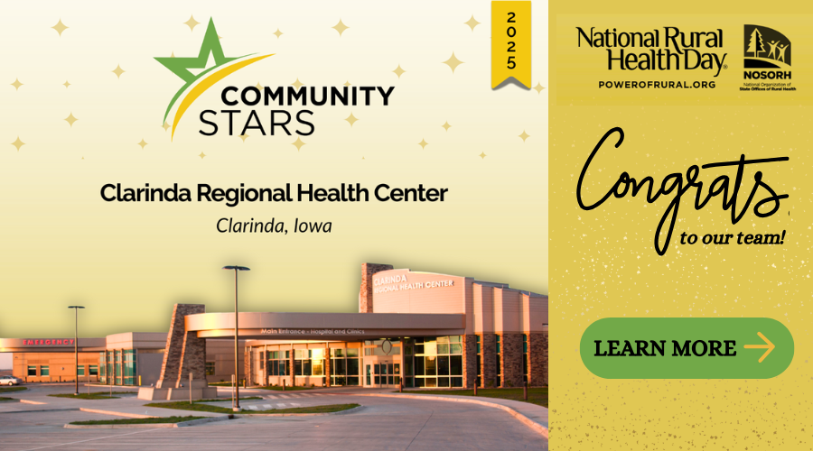 In celebration of National Rural Health Day, Clarinda Regional Health Center (CRHC) has been recognized as a 2025 Community Star by the National Organization of State Offices of Rural Health (NOSORH). The award honors individuals and organizations that make extraordinary contributions to rural health nationwide, and CRHC is proud to be among this year’s forty-seven statewide honorees, exemplifying innovation, compassion, and collaboration. Clarinda Regional Health Center, a Critical Access Hospital and cornerstone of care in southwest Iowa, also earned multiple accolades in 2025, including Becker’s 150 Top Places to Work in Healthcare and Best of Midwest awards in Mental Health Services, Assisted Living, and Orthopedic Surgery. “CRHC’s commitment to Advancing Exceptional Care is rooted in our responsibility to serve, support, and uplift the people of southwest Iowa,” said Chuck Nordyke, CEO of Clarinda Regional Health Center. “Our team works every day to ensure rural patients have access to outstanding care close to home. The strength of our organization comes from our people, our partnerships, and the community we are proud to serve.” Impactful Programs, Real Results CRHC goes beyond hospital walls with programs that enhance safety, wellness, and opportunity in the community: Guardian Helmet & Concussion Sensor Program – Protecting youth athletes with advanced technology. Community School Nurse Program – Bringing healthcare and education directly to schools. Wellness Roots Garden – Hands-on nutrition education for all ages. Backpack & Fresh Eats Programs – Providing meals for students and families in need. Little Food Pantry – 24/7 discreet access to food for the community. Investing in Workforce & Rural Excellence As Clarinda’s largest employer, CRHC leads with its Employee Wellness Program, twice named Iowa’s Healthiest State Small Workplace . The program tackles burnout and promotes well-being through fitness challenges, mental health resources, and nutrition education. Power of Rural CRHC exemplifies the Power of Rural: neighbors caring for neighbors, delivering high-quality care with trust, accountability, and innovation—even in remote communities. Partnerships with the Iowa State Office of Rural Health further strengthen telehealth, hospitalist programs, and statewide performance standards. CRHC’s recognition as a Community Star and multiple awards highlight a simple truth: exceptional rural healthcare is possible, right here in southwest Iowa.